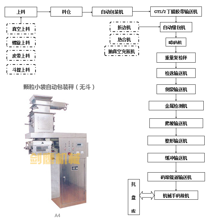 适用范围 尿素、复肥、味精、塑料粒子、聚丙烯、矿砂、食品添加剂等颗粒物料的包装生产线